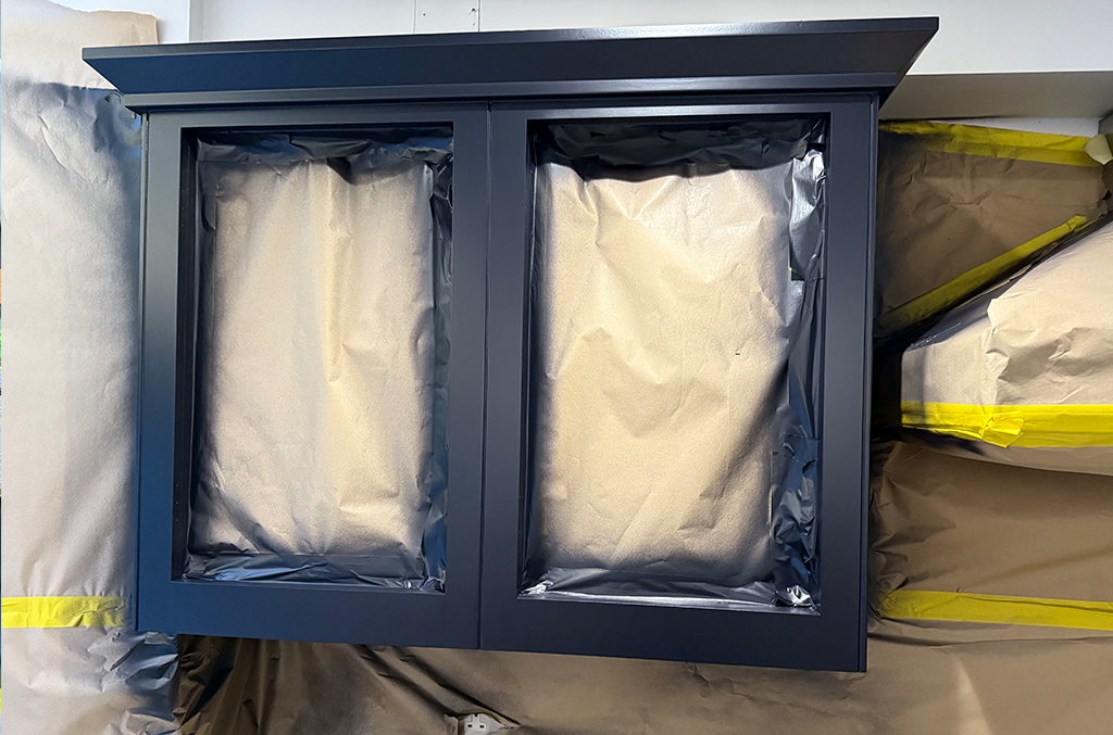 Once prepared, doors and drawers were professionally spray finished to achieve a smooth, even coating across all surfaces.