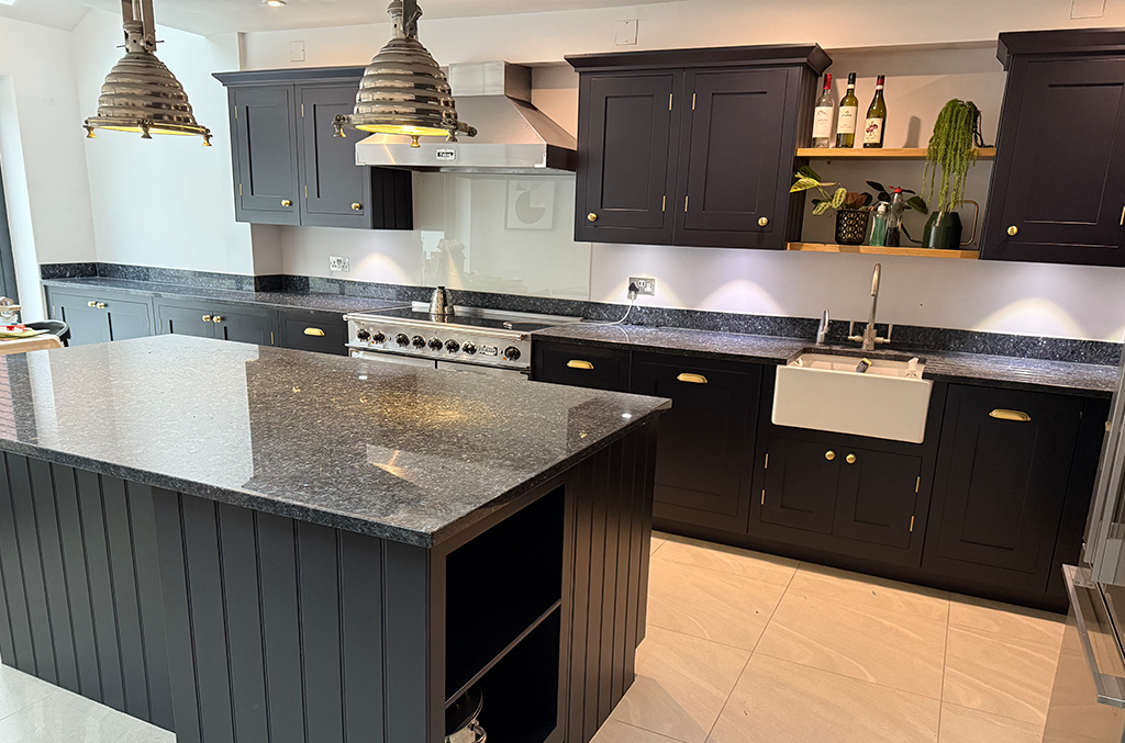 The kitchen was professionally spray painted in Dulux Heritage – Black Raven’s Flight, creating a smooth, durable, factory-quality finish throughout.