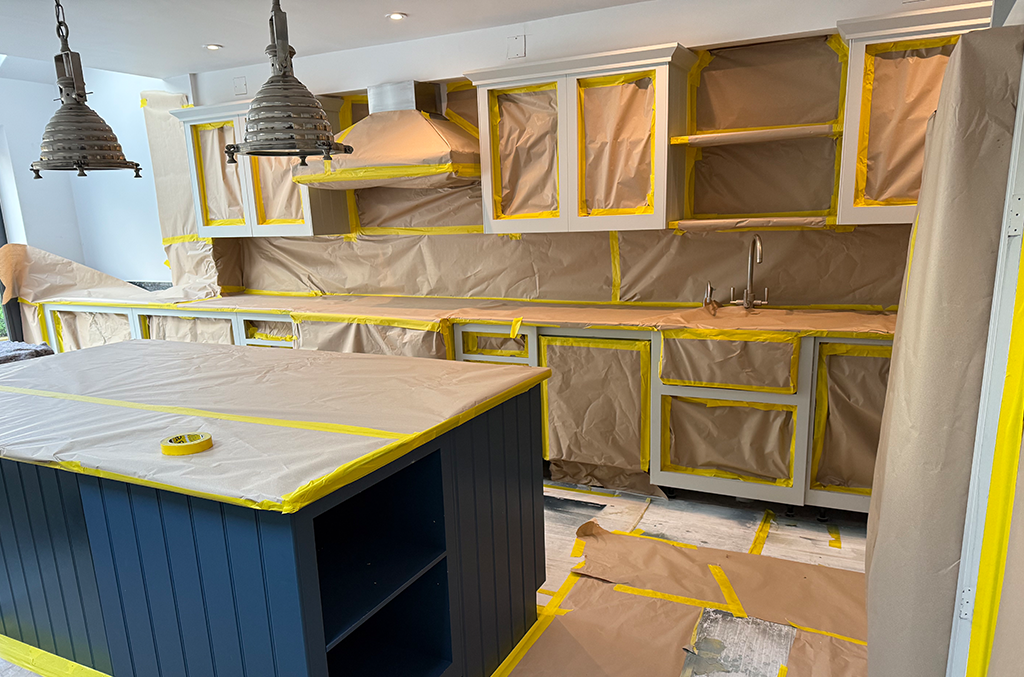 On-site elements were carefully masked and refinished to match, ensuring consistency throughout the kitchen.