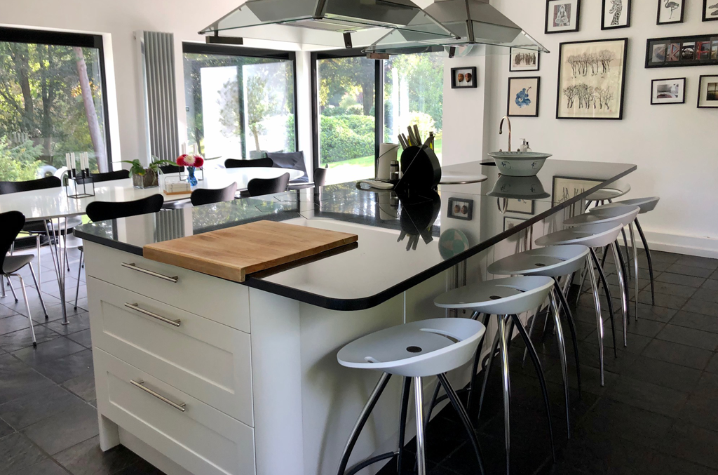 Back at our workshop, we meticulously cleaned, sanded, primed and resprayed all the doors, cupboards, and stools. Our advanced spray booth technology ensures an even, showroom-quality finish every time. Just seven days later, we returned to the client's property in Dorking to reinstall the freshly resprayed kitchen cabinet doors and the new, coordinated panel surround for the fridge.