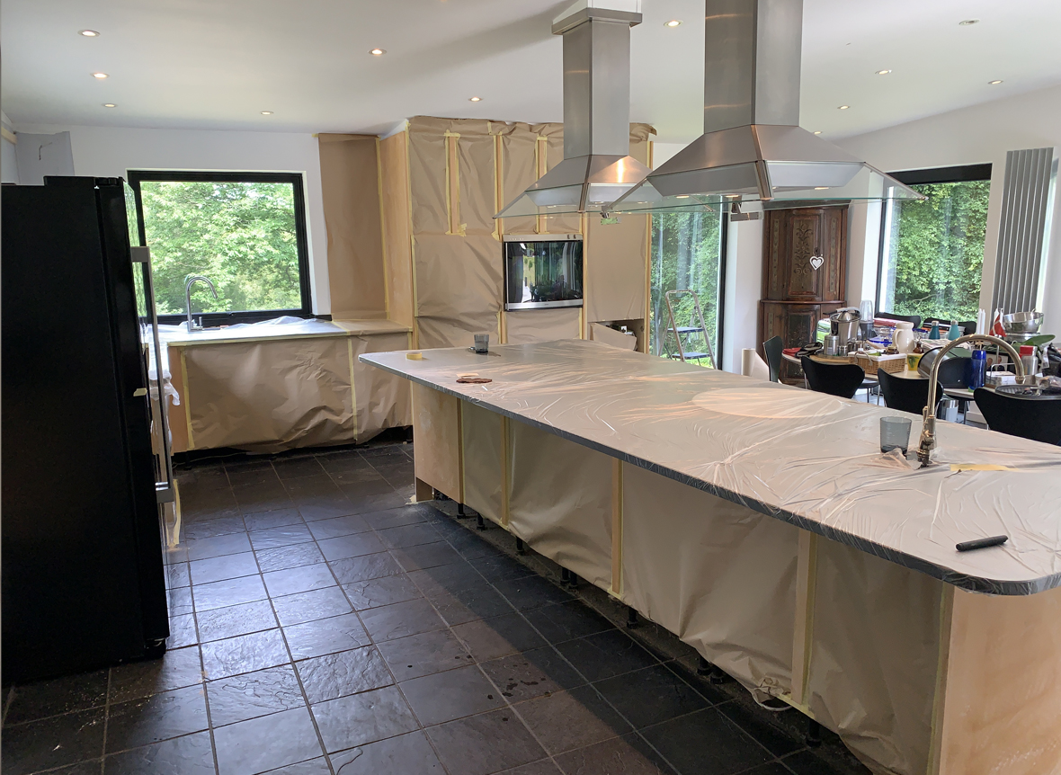 Preparation is the key to a professional finish. Our expert team spent a full working day carefully removing all the kitchen cupboard doors and drawer fronts. These components were taken back to our workshop for a controlled and flawless spray painting process.