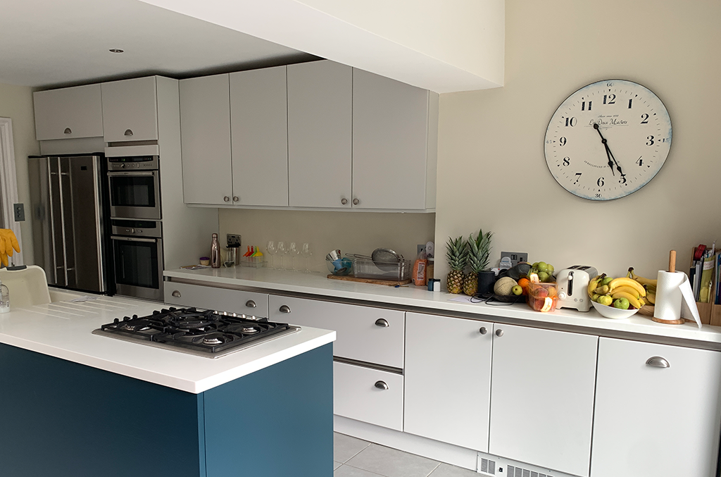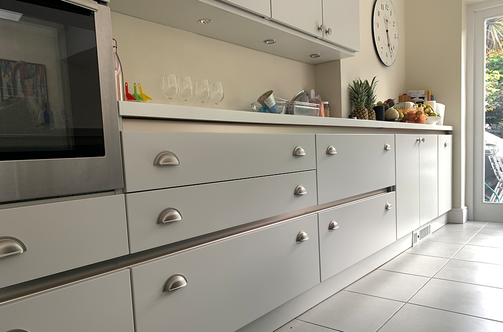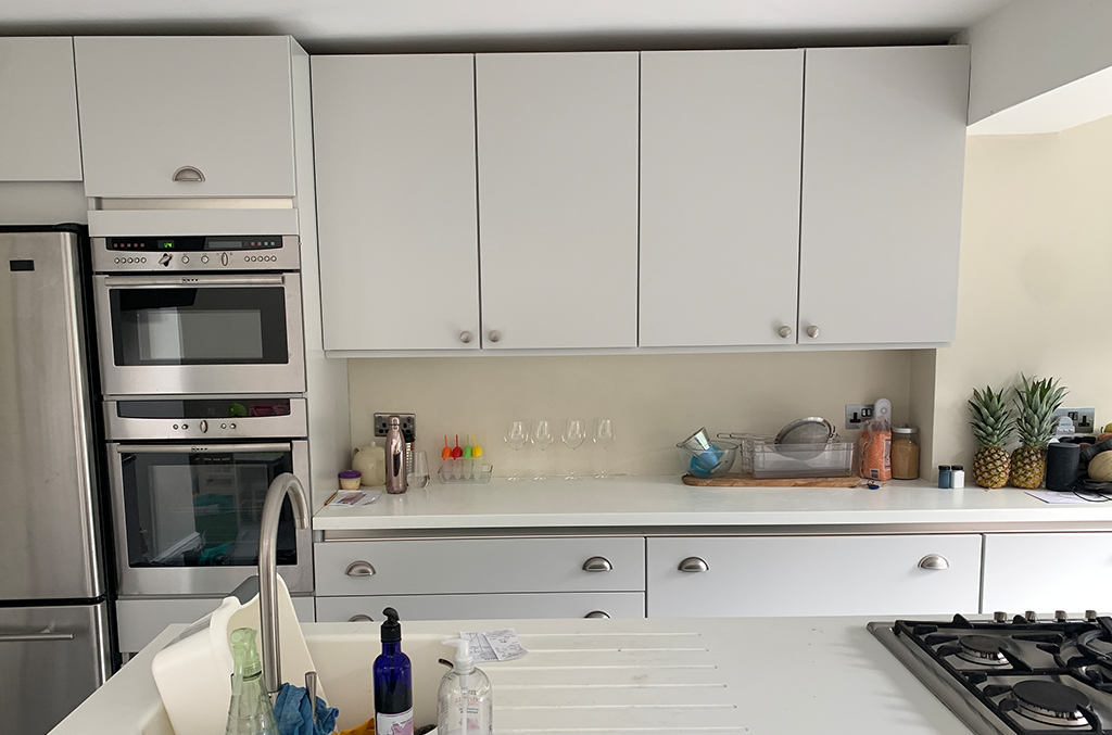 The client wanted to modernise the space without replacing the kitchen, taking inspiration from magazines and Pinterest. The aim was to achieve a lighter, more contemporary look with a two-tone kitchen colour transformation, along with new cup handles and knobs.