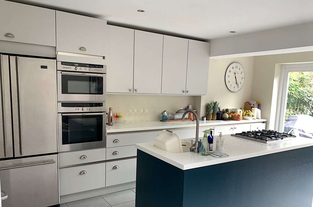 The result is a lighter, more contemporary kitchen with added depth and contrast — demonstrating how kitchen cabinet spray painting can completely modernise a space without the need for replacement.